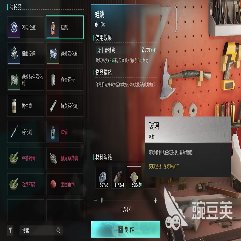当异常能量累积超过30点时,发条青蛙将自动启动,开始生产发条和万能诱饵。玩家可以收集这些素材,加上酸液和玻璃,并在轻工艺台上制作蛙跳异响药剂。这种药剂的有效期为两小时,虽然会增加耐力消耗,但在PVE剧本或探索中非常实用。相比之下,在PVP模式中,由于耐力限制,使用频率较低。
